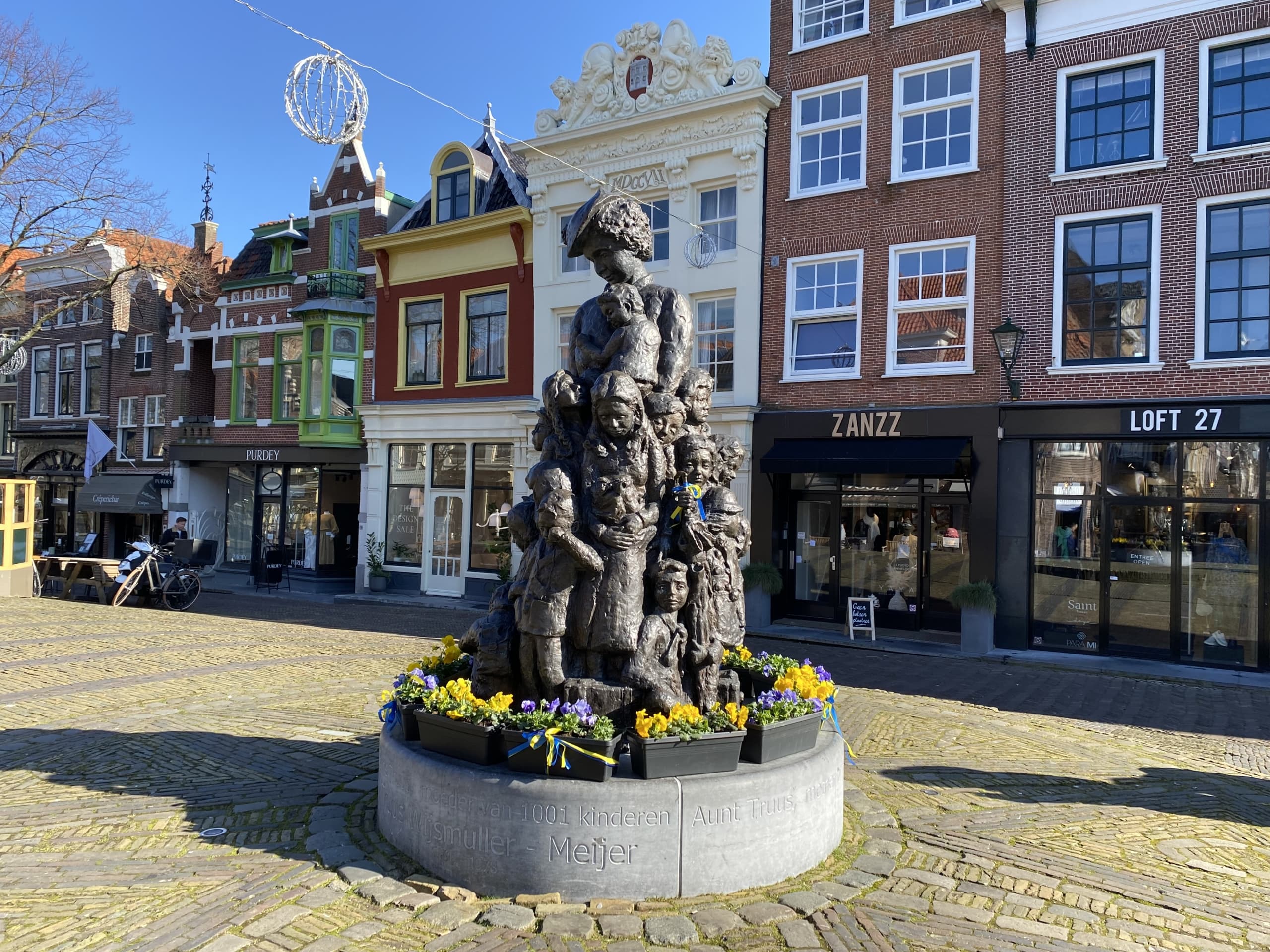 Truus has 28 children around her. In Jewish culture, this number stands for ‘strength’, ‘home’ and ‘safety’. The statue was made by sculptors Annet Terberg and Lea van Wijnhoven from IJsselstein. The costs of the statue, the pedestal and the lighting were paid for with the many donations from citizens and companies, funds, the Municipality of Alkmaar and the Historical Society of Alkmaar. On the edge of the pedestal is written in four languages: “Aunt Truus, mother of 1001 children”, based on the text in the obituary, with which the adult transport children honoured Truus in 1978 when she died.